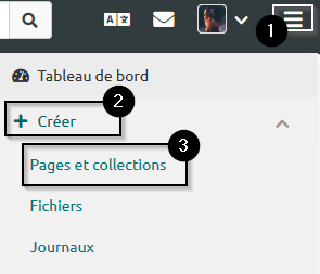 Étape 1 : Cliquez sur l’icône du menu principal, déroulez la catégorie « Créer » puis cliquez sur « Pages et collections »