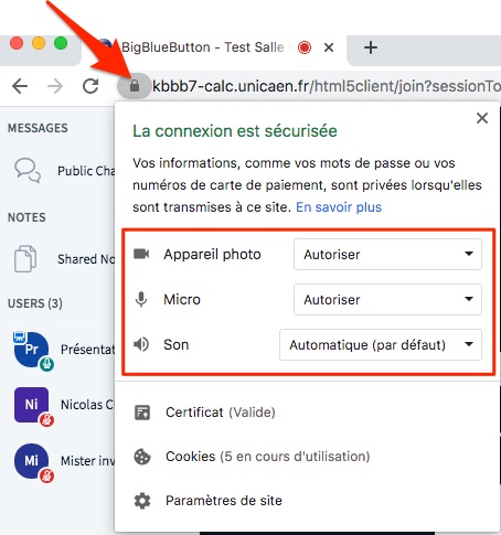 Si vous utilisez le navigateur Chrome et recevez le message “La webcam est utilisée par une autre application”, assurez-vous d'avoir autorisé les autorisations demandées par Chrome.
