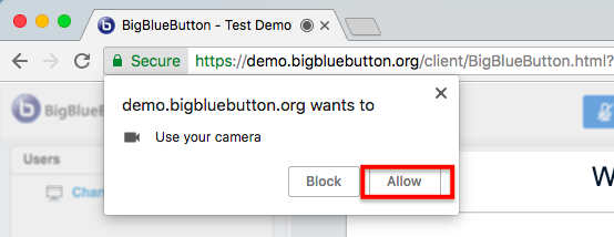 Si vous utilisez le navigateur Chrome et recevez le message “La webcam est utilisée par une autre application”, assurez-vous d'avoir autorisé les autorisations demandées par Chrome.