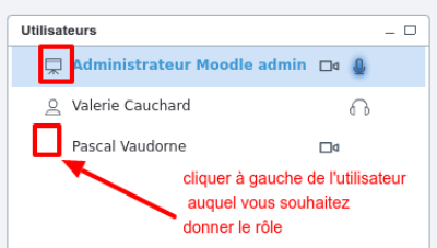 Par défaut, le premier modérateur qui entre dans la réunion se voit attribuer le statut de présentateur. pour passer le statut du présentateur, cliquez à gauche du nom de l'utilisateur.