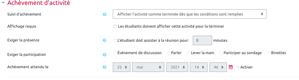 Il est maintenant possible de régler les achèvement sur la participation à la webconférence ( temps de présence et interactions)