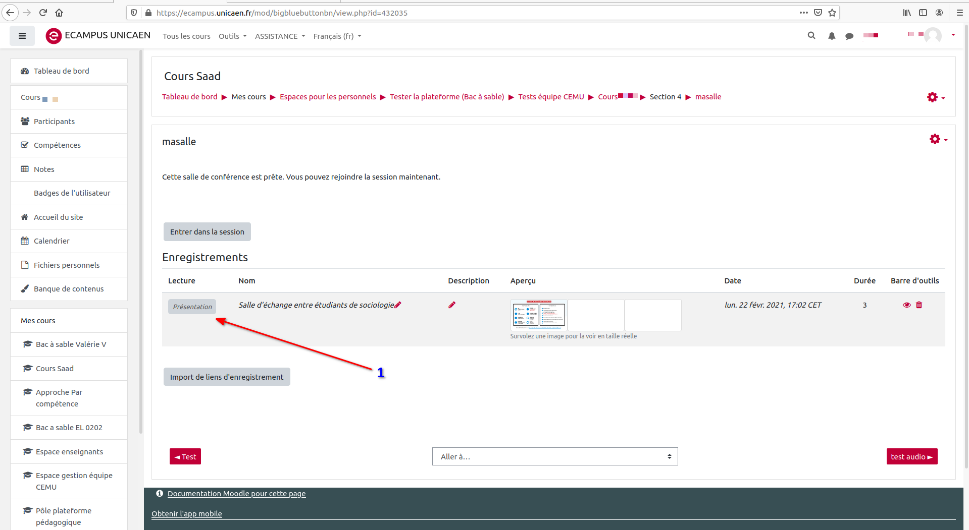 Ainsi, seul le lien de l’enregistrement s'affiche dans la salle de visioconférence sur ecampus (lien pointant vers le fichier enregistré dans le serveur dédié, externe à Ecampus, voir capture d’écran).
