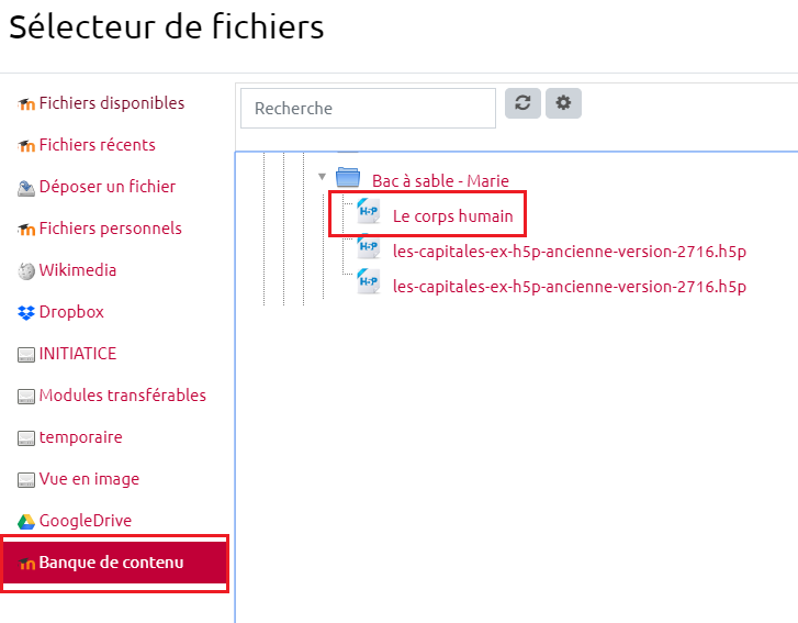Cliquez sur “banque de contenus” puis sur le nom du fichier à importer (ici “corps humain”)