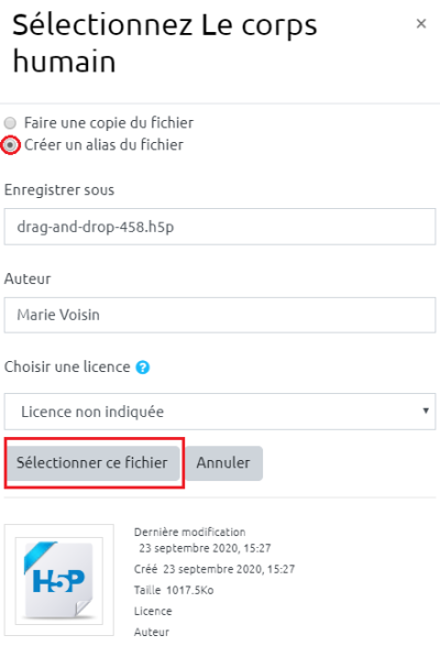 Une fenêtre s'ouvre. Vous pouvez choisir de “copier ce fichier” ou de “créer un alias” (recommandé). “Créer un alias” permet de mettre à jour automatiquement tous les modules importés par alias si vous modifiez le fichier source. Cliquez sur “sélectionner ce fichier”.