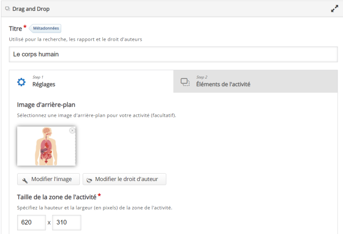 Une nouvelle page s'ouvre. Vous pouvez à présent suivre les étapes pour créer votre activité. Dans le cas du “drag and drop” par exemple, vous commencez par nommer votre activité et télécharger une image de fond.