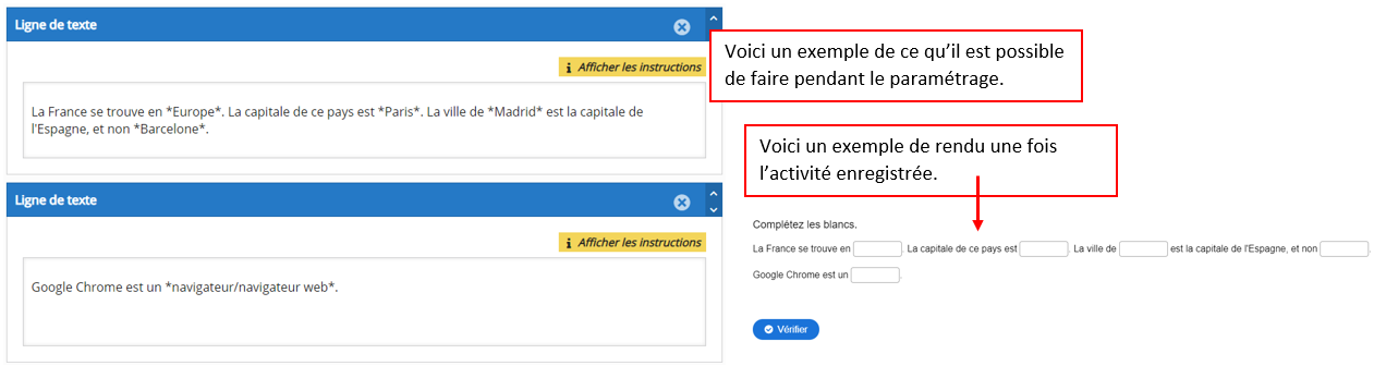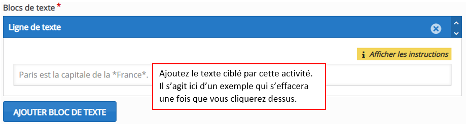 Si vous souhaitez davantage d'espaces de texte, cliquez sur le bouton 'Ajouter bloc de texte'. La limite d'affichage des blocs de texte est de 30, et chaque bloc peut contenir beaucoup de texte. Pour savoir comment paramétrer votre activité (ajouter les espaces à trouver, ajouter et séparer les différentes réponses possibles), vous pouvez cliquer sur 'Afficher les instructions'.