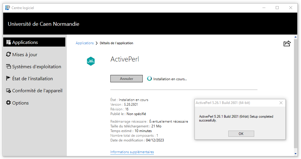 Pour que MiKTeX fonctionne correctement il faut installer Perl. (on utilisera pour se faire ActivePerl, qui se trouve aussi dans le centre logiciel).