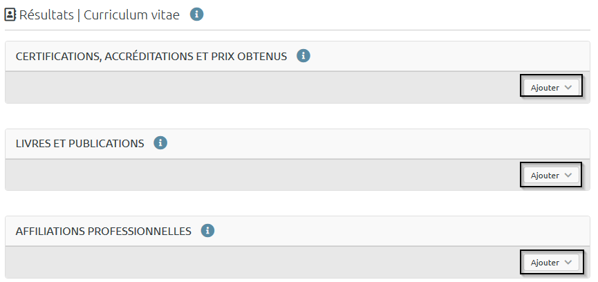 L’onglet « Résultats » vous offre la possibilité de renseigner les certifications, accréditations et prix que vous avez obtenus, vos publications ainsi que vos affiliations professionnelles.