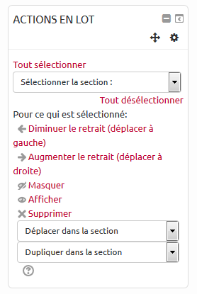 Il est possible de sélectionner un ou plusieurs éléments, tous les éléments du cours ou tous les éléments d'une section. Avec votre sélection, vous pouvez gérer les retraits, masquer ou montrer les éléments, supprimer massivement ou les déplacer dans une autre section.