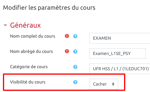 Il vous suffit de cliquer sur le lien ou bien d’accéder aux paramètres du cours et de modifier (de “cacher” à “afficher” ) le paramètre suivant :