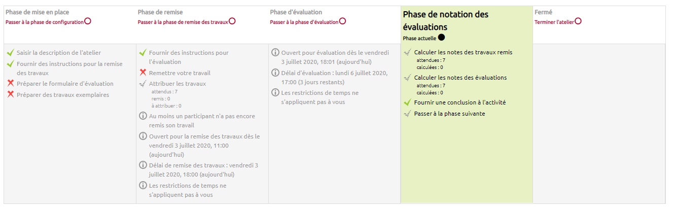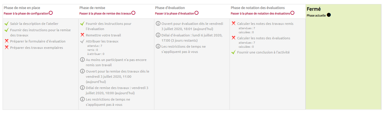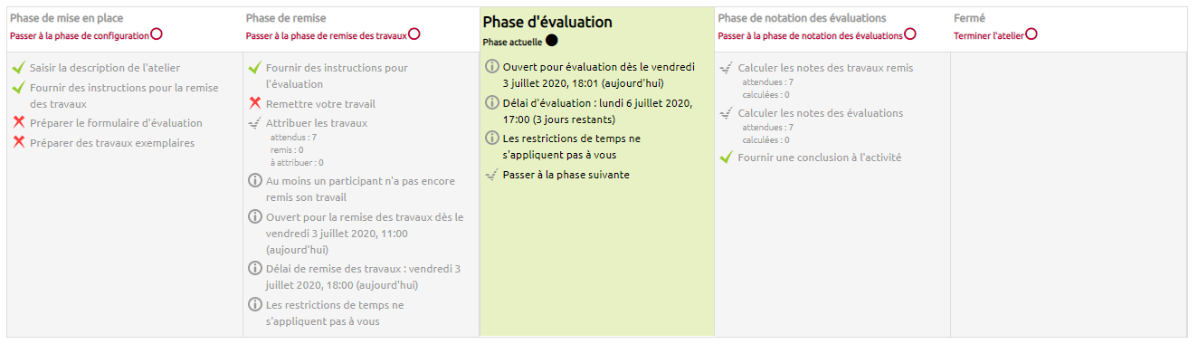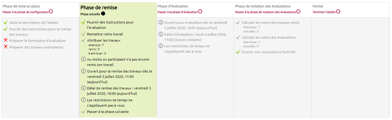 La phase de mise en place correspond au moment où l'enseignant paramètre l'atelier, complète le formulaire d'évaluation et ajoute des travaux exemplaires.