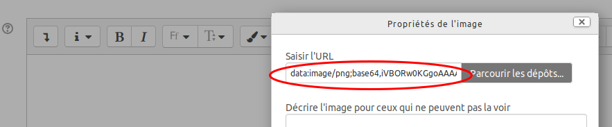 Dans les champs où Moodle permet d'entrer un contenu au format HTML (par exemple une description de cours), quand on veut insérer une image, il faut cliquer sur le bouton image, puis renseigner l'adresse (URL) de l'image, c'est-à-dire l'endroit où elle se trouve. En effet, l'image n'est pas directement intégrée dans le code HTML, qui n'est que du texte formaté d'une certaine manière, mais au contraire seulement référencé. En d'autres termes le texte HTML qui compose le document fait référence à un fichier image qui se trouve ailleurs, pour que l'image qu'il contient puisse s'afficher.