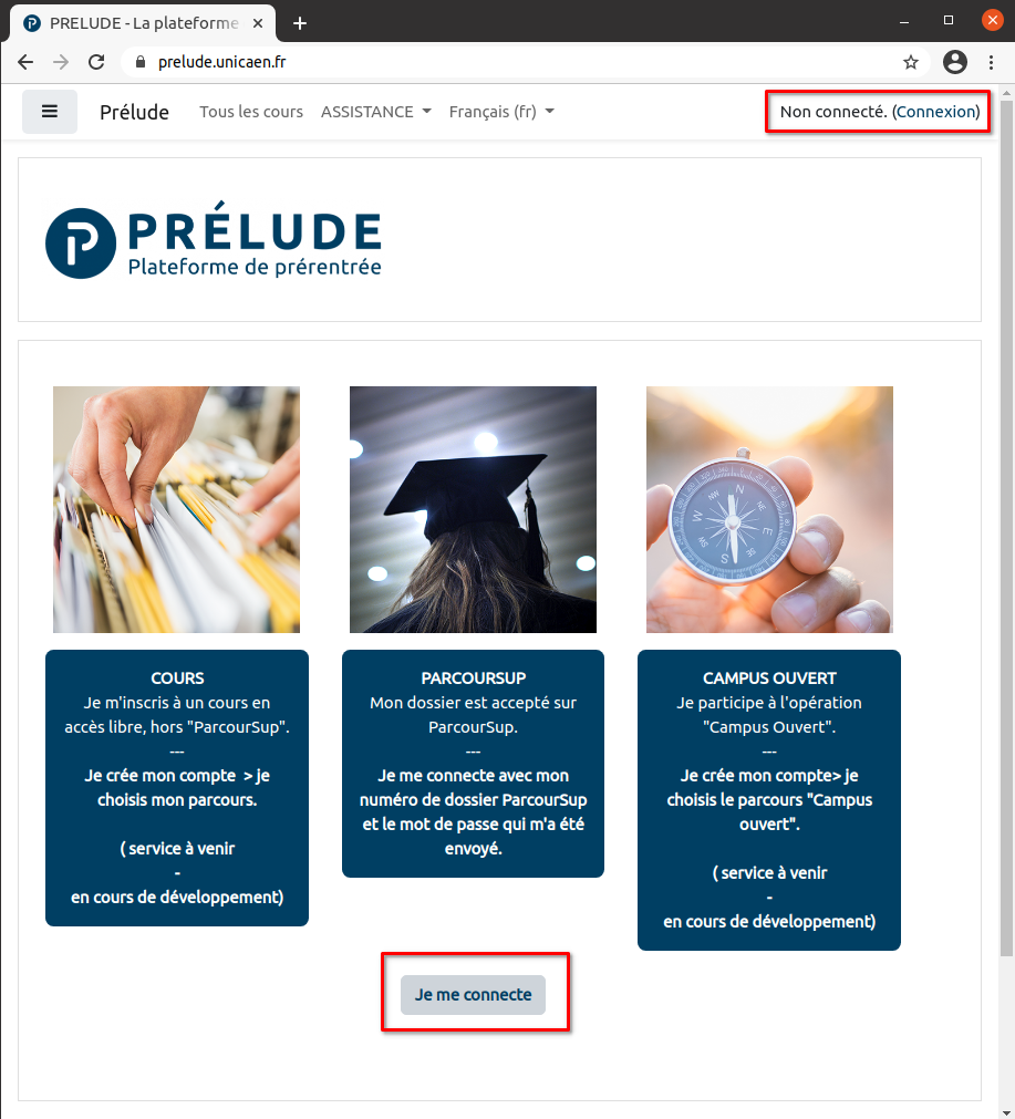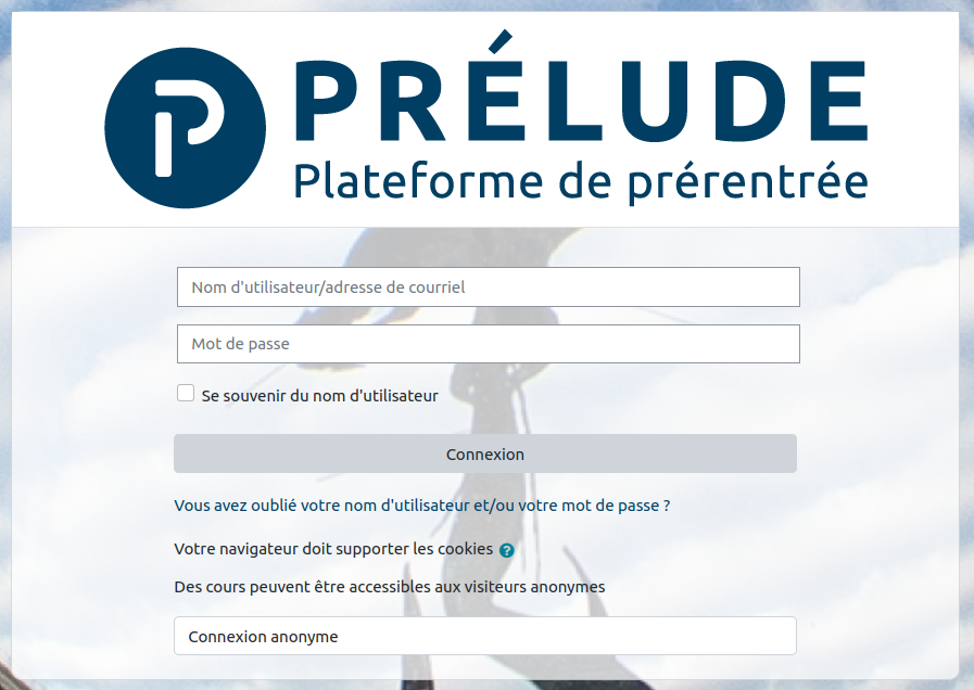La plateforme prélude n'utilise pas la méthode d’authentification habituelle par CAS qui vous permet avec une seule authentification d'accéder à un ensemble de services numérique. En conséquence, même si vous êtes déjà authentifié sur un autre service (zimbra, Ecampus, etc.), vous devrez retaper vos codes pour accéder à Prélude.