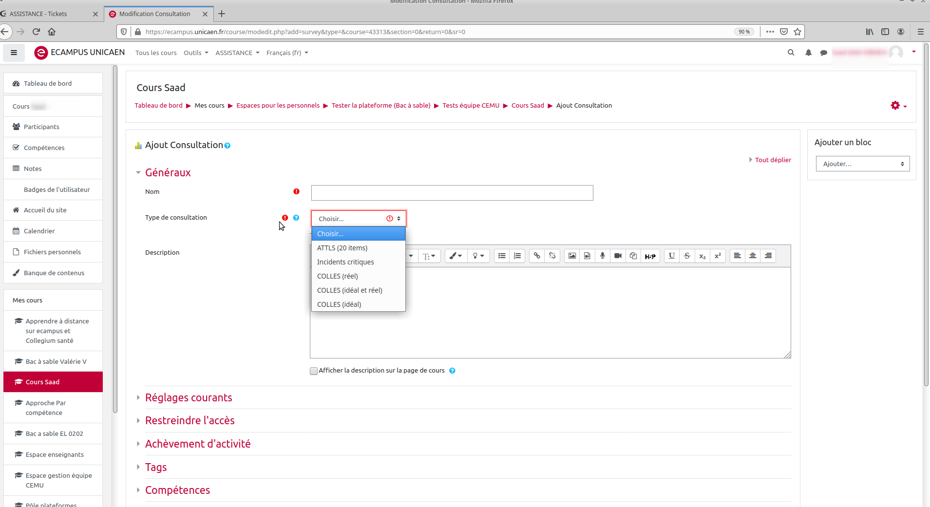 - Ensuite, après avoir donné un nom à l'activité, choisir le type de questionnaire souhaité parmi la liste de questionnaires proposée dans le menu déroulant.
