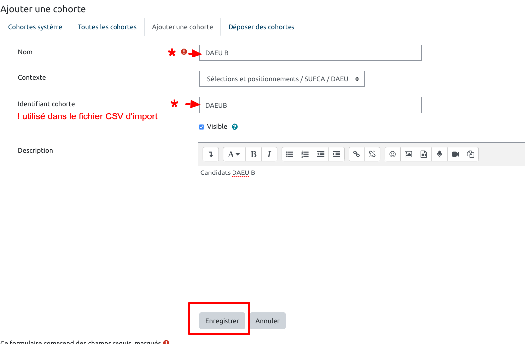 Contrairement à Ecampus et Collegium, sur PRELUDE, les cohortes ne sont pas automatisée par rapport au système d'information. Il est donc nécessaire de les créer manuellement pour pouvoir les utiliser ensuite , en particulier pour l'inscription en masse (voir Importer des utilisateurs sur la plateforme PRELUDE.