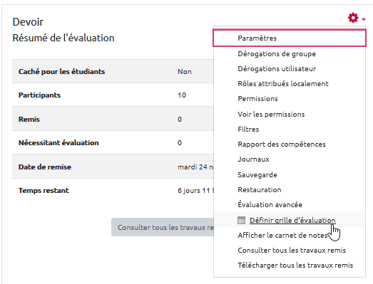 - cliquer sur le devoir, puis sur son rouage et sélectionner “paramètres”