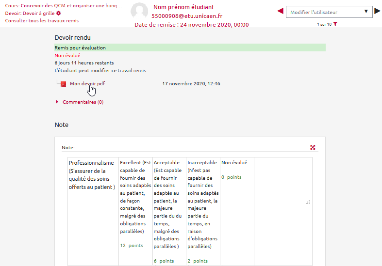 ainsi que la date de correction, l'identité du correcteur, la note et le commentaire d'ensemble.