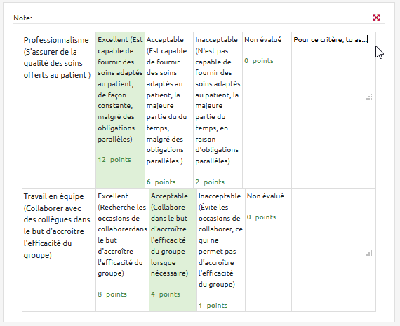 - cliquer sur les niveaux correspondants à la performance de l'étudiant (ils se colorent en vert)