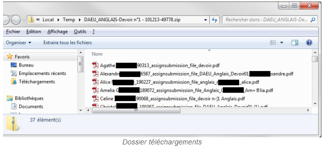 - Dans l'archive ZIP, se trouvent toutes les copies remises (pour brouillon ou évaluation) avec la date de remise, le type de fichier(.doc, .pdf…).
