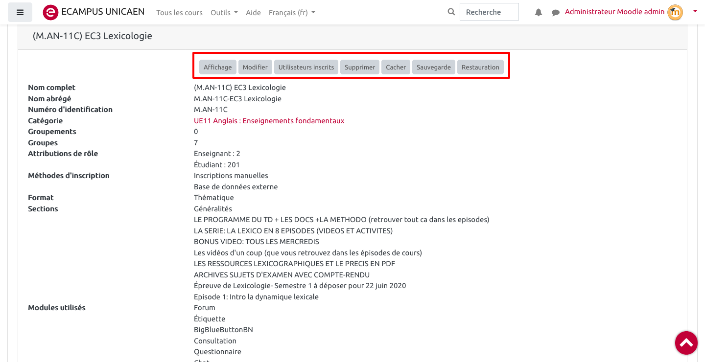 Ensuite cliquez sur un cours , puis rendez vous au bas de la page. Un certain nombre d'opération d'administration de d'affichage du cours sont possibles :