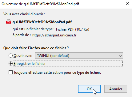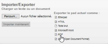 Afficher le texte sourceAnciennes révisionsLiens de retourExporter en PDFExportation ODTHaut de page Table des matières Exporter le contenu d'un Etherpad Lite Étape 1 : entrer dans l’Etherpad Étape 2 : cliquer sur le bouton "Importer/Exporter..." Étape 3 : cliquer sur le format d'export souhaité Étape 4 : enregistrer le document créé Exporter le contenu d'un Etherpad Lite Étape 1 : entrer dans l’Etherpad Étape 2 : cliquer sur le bouton "Importer/Exporter..." Étape 3 : cliquer sur le format d'export souhaité Étape 4 : enregistrer le document créé moodle/etherpad/export.txt Dernière modification : il y a 14 joursde 127.0.0.1