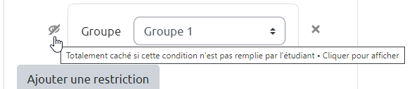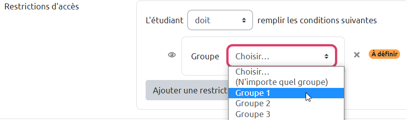 - n activités BBB pour n groupes (voir Créer et utiliser une webconférence BigBlueButton (BBB)) en paramétrant l'accès restreint comme l'Etherpad ci-dessous) ;
