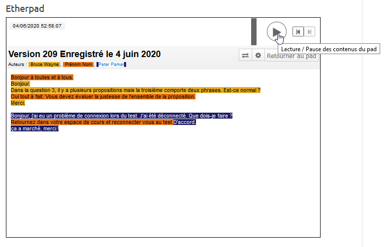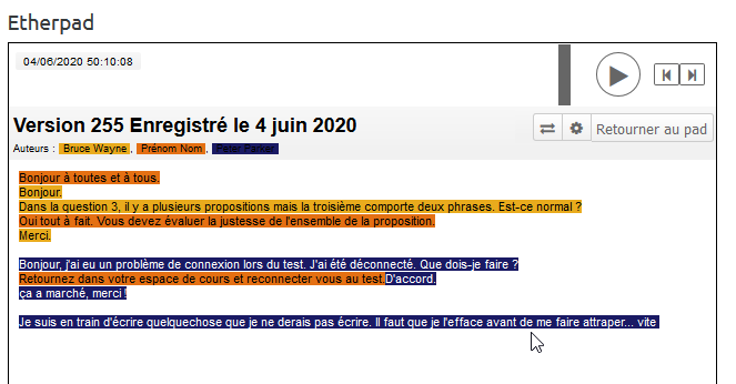 Tout les actions dans l'Etherpad sont enregistrées. Il suffit de naviguer dans l'historique pour retrouver un message, qui l'a écrit et quand.