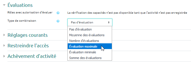 - Évaluation maximale : la note la plus haute obtenue par l'étudiant est utilisée comme note finale. Cette méthode est utile pour mettre l'emphase sur le meilleur travail des participants, leur permettant de publier un message de grande qualité et un certain nombre de messages plus ordinaires.