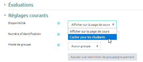- Créer le forum selon la méthode proposé dans la documentation : Créer un forum en choisissant pour le paramètre “Réglages courants” / “Disponibilité”, l'option “Cacher pour les étudiants” :