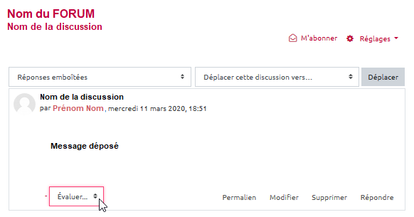 - Refaire la démarche décrite à l'étape 2 et choisissez la nouvelle note. Si vous souhaiter supprimer la note d'un message, cliquer dans le menu déroulant sur “Évaluer…” comme indiqué ci-dessous :