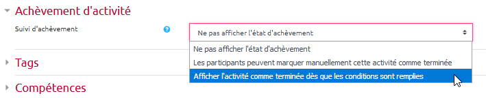 - Choisir l'option “Afficher l'activité comme terminée dès que les conditions sont remplies” :