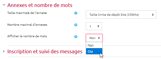 Afficher le texte sourceAnciennes révisionsLiens de retourExporter en PDFExportation ODTHaut de page Je veux que le nombre de mots des messages soient affichés Dans les paramètres du forum, cliquer sur “Annexes et nombre de mots” : choisir oui dans “Afficher ne nombre de mots”: Retour aux paramètres avancés du forum Paramètres avancés du FORUM moodle/forum/parametres_avances/nombre_de_mots.txt Dernière modification : il y a 2 semainesde 127.0.0.1