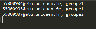 Ce fichier doit comporter, par ligne : une adresse mail et un nom de groupe séparés par une virgule. Comme ceci :