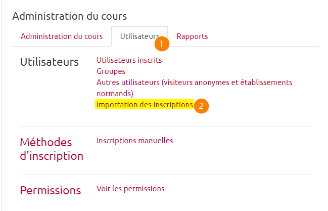Sur cette nouvelle page, se rendre dans l'onglet 'Utilisateurs'(1) et choisir 'Importation des inscriptions'(2)