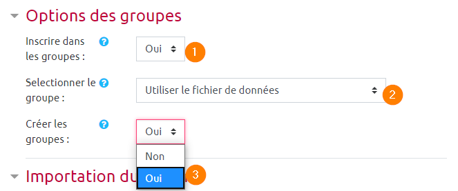Dans la rubrique suivante, Options des groupes, sélectionner 'Oui' dans le premier menu déroulant(1). La modification des champs suivants est alors accessible. Il faut conserver 'Utiliser le fichier de données'(2) Sélectionner le groupe. Pour le dernier champ, Créer les groupes, sélectionner 'Non' si les groupes existent déjà dans l'espace de cours, sélectionner 'Oui' pour que le groupe associé à chaque étudiant soit créé dans l'espace de cours ecampus.