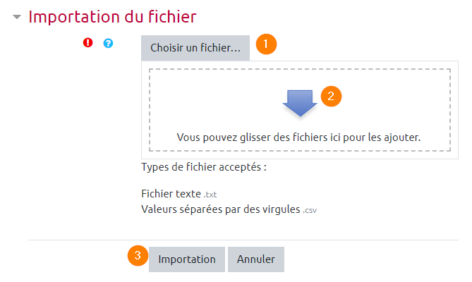 La dernière rubrique concerne l'importation, c'est-à-dire l'envoi du fichier préparé vers la plateforme ecampus. Il est possible d'ajouter le fichier en cliquant sur le bouton 'Choisir un fichier'(1) ou de le glisser-déposer sur la flèche bleue(2). Une fois que le nom du fichier apparaît à la place de la flèche bleue, il ne reste qu'à cliquer sur 'Importation'(3)