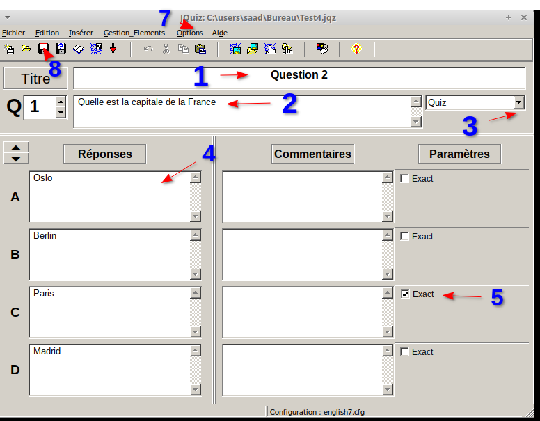 - Une fois le quiz prêt, vous devez cliquer sur enregistrer (logo disquette), puis donner un nom à votre fichier et enfin choisir l’extension .jqz en vue de l’importer dans Moodle par exemple.