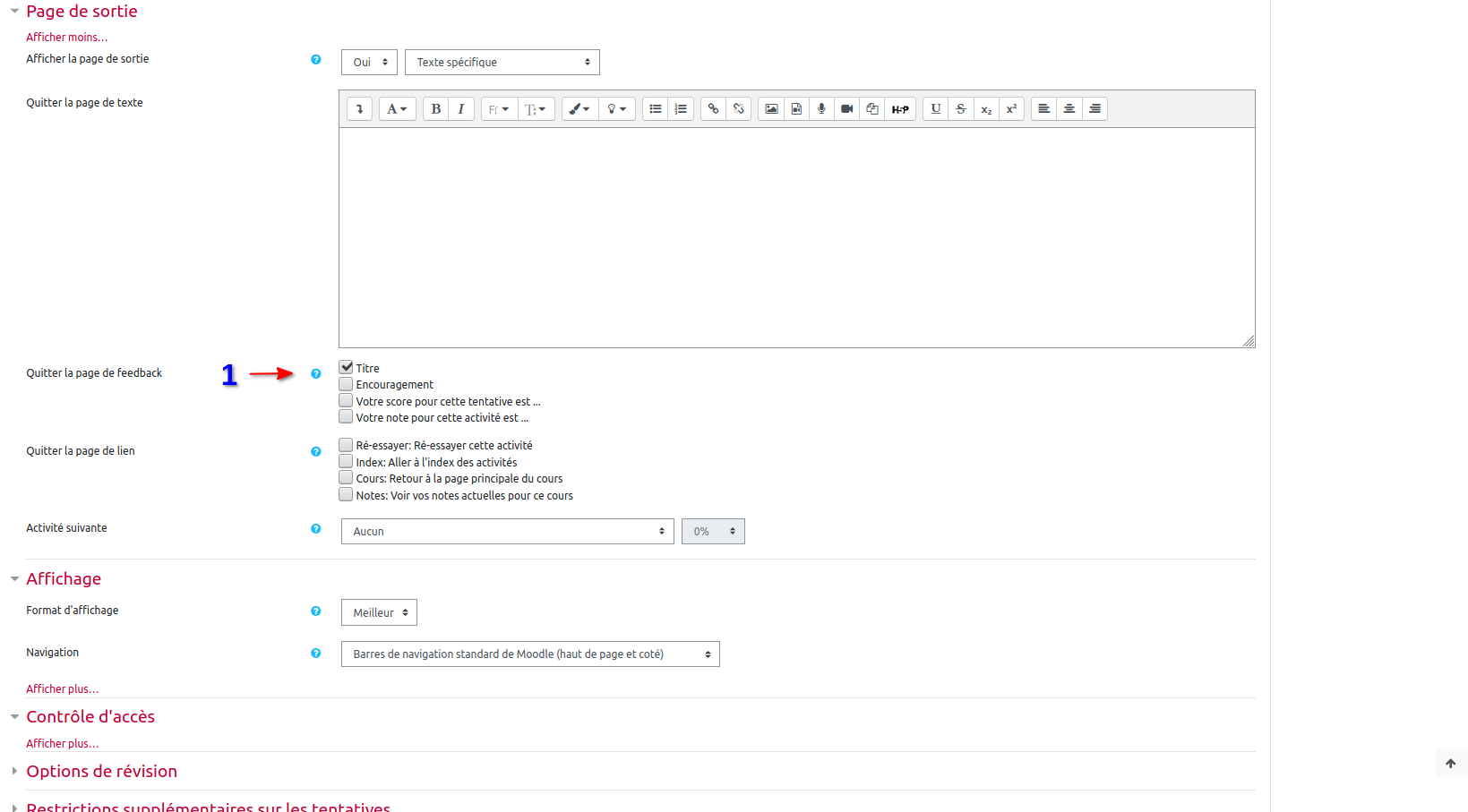 - Vous avez le choix d’afficher des éléments dans page initiale (page où l’étudiant sera redirigé pour faire le test), tels que le titre, la date, les tentatives des utilisateurs…etc.