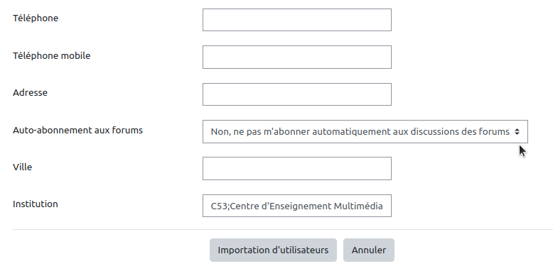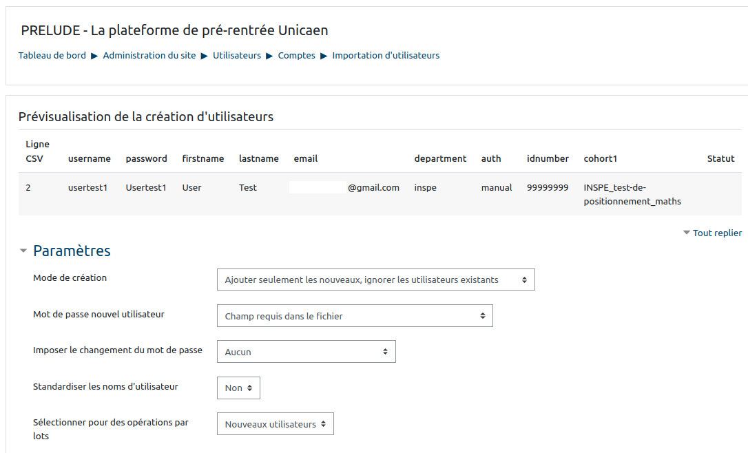Aller dans Administration du site > Utilisateurs > Comptes > Importation d'utilisateurs et déposer le fichier qui vient d'être créé.