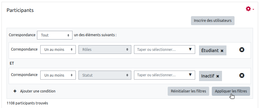 - filtrer les usagers à partir par exemple des critères Rôle = “Étudiant” et Statut = “Inactif” puis cliquer sur le bouton