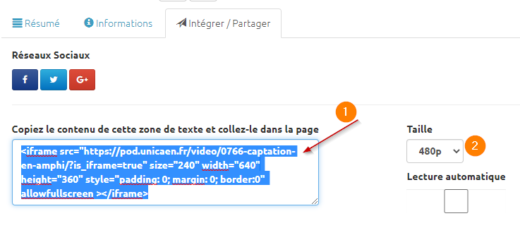 - Laisser la taille à 480p par défaut (2). L'étudiant, en fonction de la qualité de sa connexion, pourra augmenter la résolution de la visualisation s'il le souhaite.