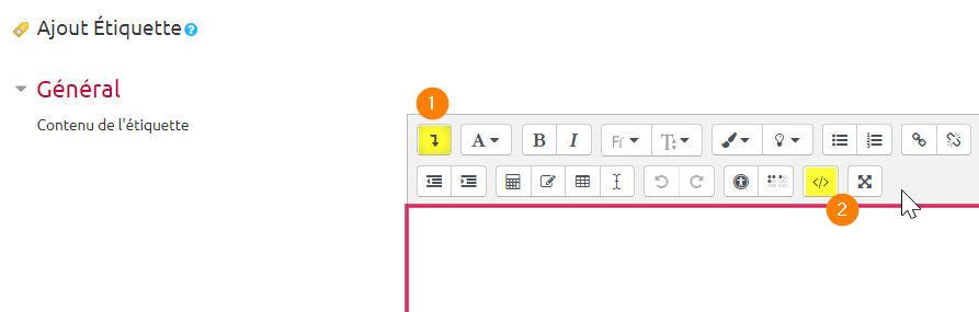 - Dans la zone d'édition du contenu de l'étiquette, sélectionner le premier bouton (1) pour faire apparaitre la deuxième ligne de bouton d'édition et choisir celui pour saisir du code HTML : '<>' (2)