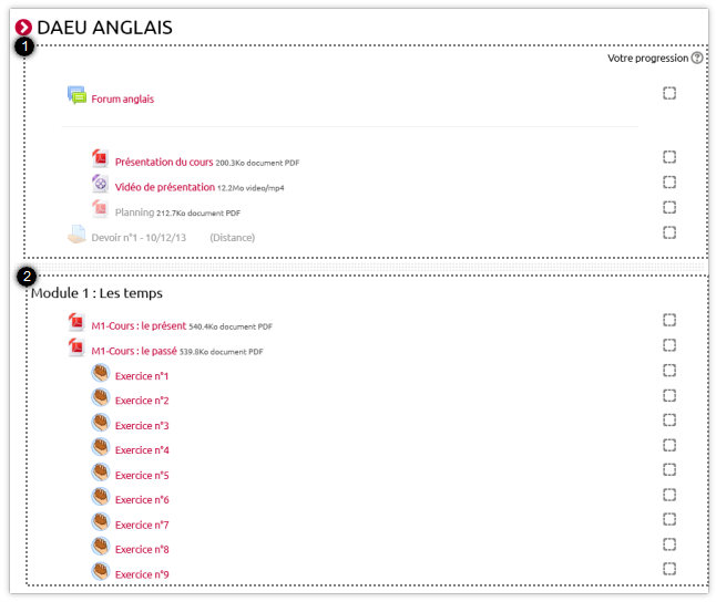- Sections contenant les ressources et activités du cours.