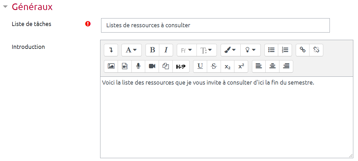 Afficher le texte sourceAnciennes révisionsLiens de retourExporter en PDFExportation ODTHaut de page Table des matières Ajouter une liste de tâches Etape 1 : Activer le mode édition Etape 2 : Cliquer sur "Ajouter une activité ou une ressource" Etape 3 : Sélectionner "activités" puis "Liste de tâches" Etape 4 : Nommer la liste de tâches et ajouter une description (optionnel) Etape 5 : Compléter les différents paramètres Ceci est une ancienne révision du document ! Ajouter une liste de tâches L'activité « Liste des tâches » permet aux enseignants de créer des listes de tâches pour le suivi des étudiants. Etape 1 : Activer le mode édition Etape 2 : Cliquer sur "Ajouter une activité ou une ressource" Etape 3 : Sélectionner "activités" puis "Liste de tâches" Etape 4 : Nommer la liste de tâches et ajouter une description (optionnel) A noter : comme pour toute activité Moodle, la description est optionnelle. Etape 5 : Compléter les différents paramètres moodle/liste_taches.1618837242.txt.gz Dernière modification : il y a 3 semaines(modification externe)
