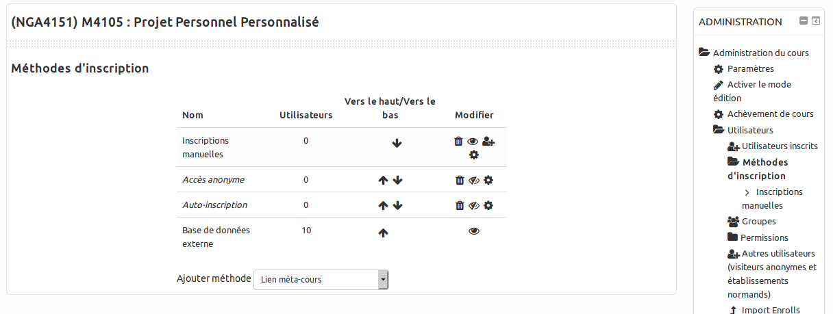 Pour ajouter un lien méta-cours dans le seul espace de cours resté visible, il faut lui ajouter une nouvelle méthode d'inscription et sélectionner 'lien méta-cours' :