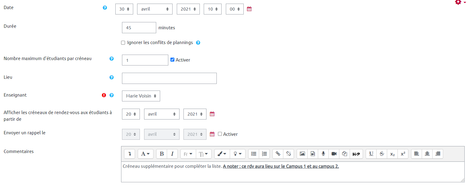 Cliquez sur “ajouter un créneau”. Vous ajoutez alors les créneaux un à un en complétant les informations demandées. Dans l'exemple ci-après, le créneau proposé est le 30/04 à 9h. Il est possible dans ce cas de mettre des commentaires pour chaque créneau.