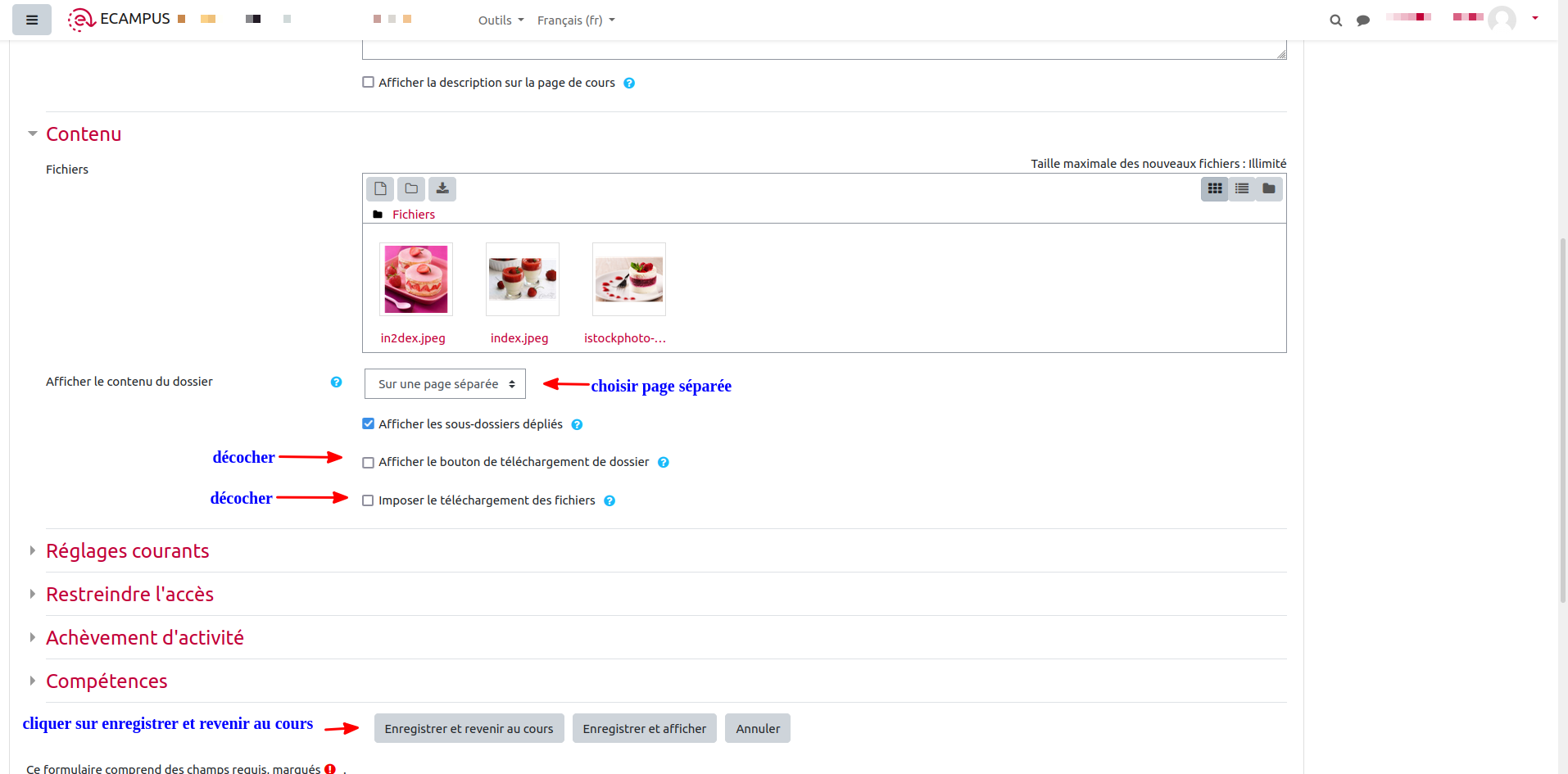 Pour ce faire, durant la paramétrage de l'activité dossier, l’enseignant doit dans la section contenu des paramètres, décocher la case imposer le téléchargement des fichiers car celle-ci est cochée par défaut.