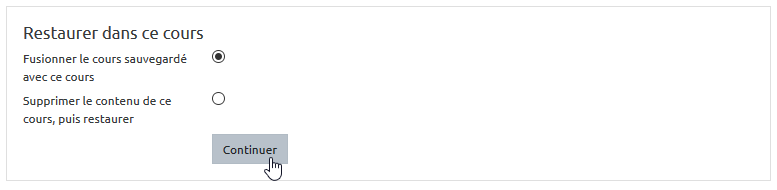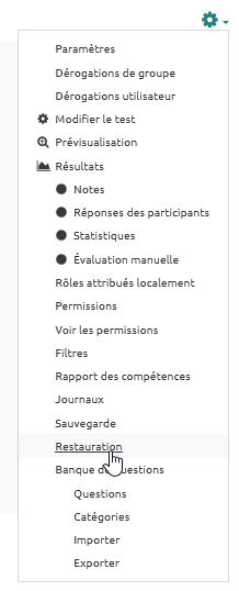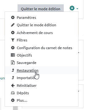 • Dans l'espace de cours de destination, cliquer sur le rouage puis sur “Restauration” :