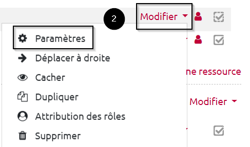 - Cliquer sur “Modifier” sur la droite de la section ou de l’activité, puis sur “Modifier la section” ou “Paramètres” :