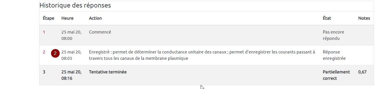 Dans la relecture d'une tentative, vous accédez aux réponses apportées (1) par l'étudiant et le moment où celles-ci ont été validées (2).